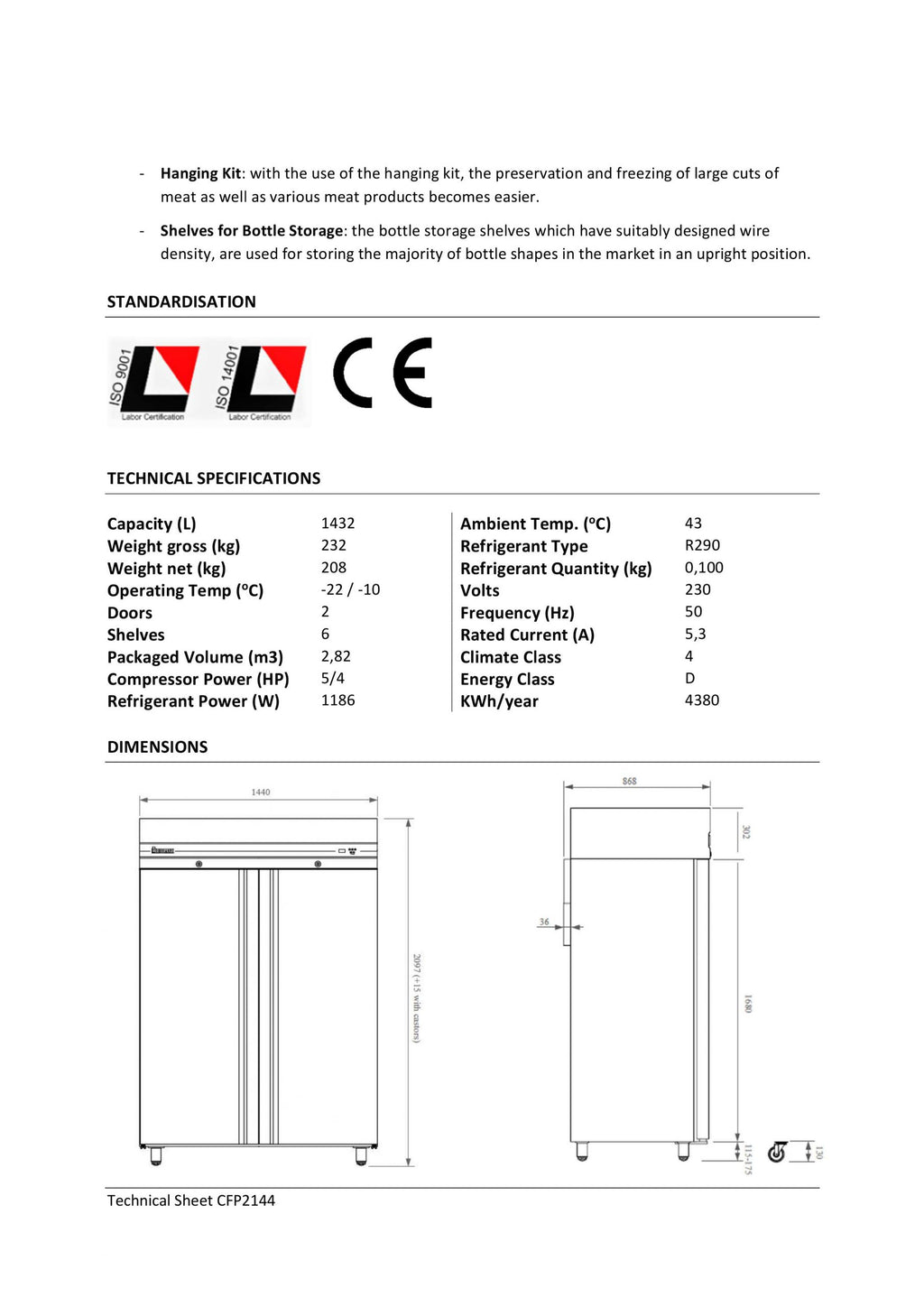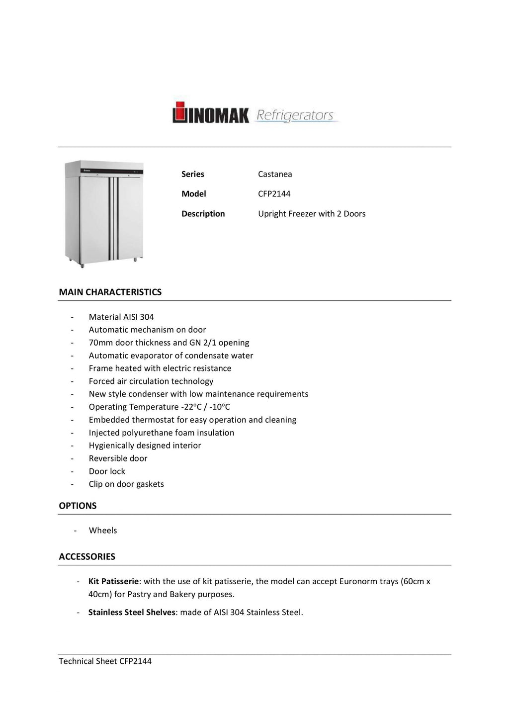 Udført i rustfrit stål AISI 304 18/8-10. Funktionstemperatur fra -20 - 0 grader. Skabets indre er designet med runde hjørner for at lette rengøring og højne hygiejne. Dørene kan vendes fra højre til venstre om nødvendigt og er med automatisk lukning ved 45 graders åbning. Pakningerne er magnetiske, hvilket sikre en optimal tæthed og kan skiftes meget enkelt. (Det er vigtigt at huske udskiftning af pakninger løbende). Fordamper er behandlet med epoxy for at sikre lang levetid. Epoxy forhindre korrosion og er anti bakteriel.