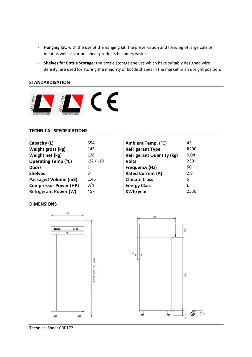 Frostskab udført i rustfrit stål med robuste, justerbare fødder. 654 liter Inklusiv 3 trådhylder Tilpasset standarden 2/1 GN Temperatur er indstillet fra -2 til -20 grader Mål: 720 x 868 x 2095 mm Effekt: 230 V / 324 W