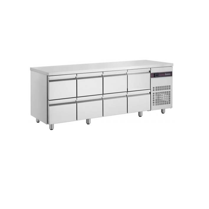 Kølebord i rustfrit stål med højdejusterbare fødder. Skufferne passer til 1/1 GN Kølebord er indstillet til 2 – 8 grade Mål: Bredde 2240 x Dybde 700 x Højde 870 mm Effekt: 230V / 245W