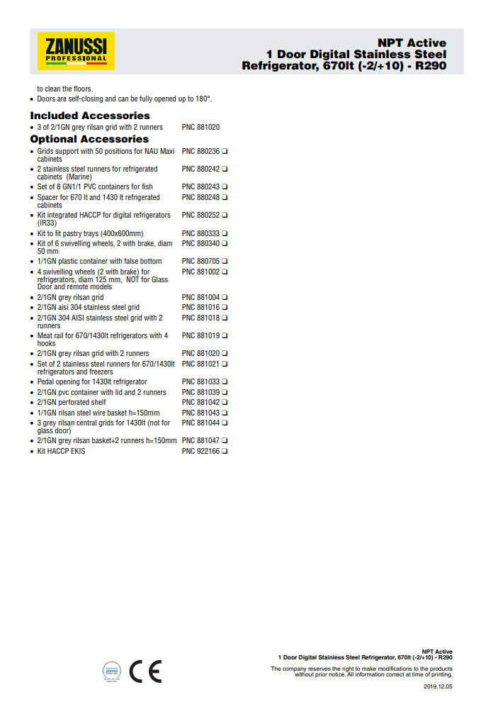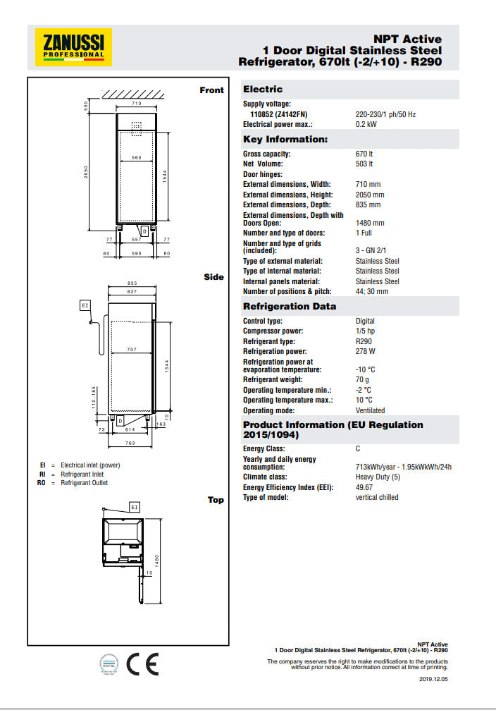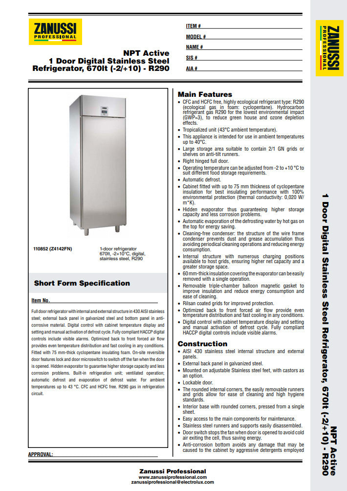 Køleskab udført i rustfrit stålJusterbare fødderKapacitet: 670 LTemperatur: -2 til +10 graderMål: 710 x 835 x 2050 mm230 V / 0,2 kW